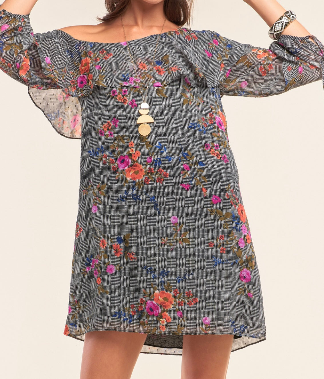 Multi Color Checkered Floral Print Loose Fit Off-The-Shoulder 3/4 Balloon Sleeve Ruffle Hem Mini Dress