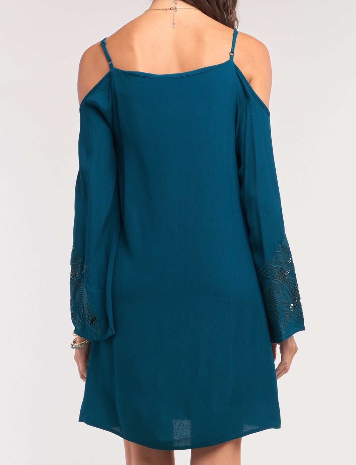 Teal Green Off-The-Shoulder Flare Long Sleeve Square Neck Crochet Embroidery Mini Dress